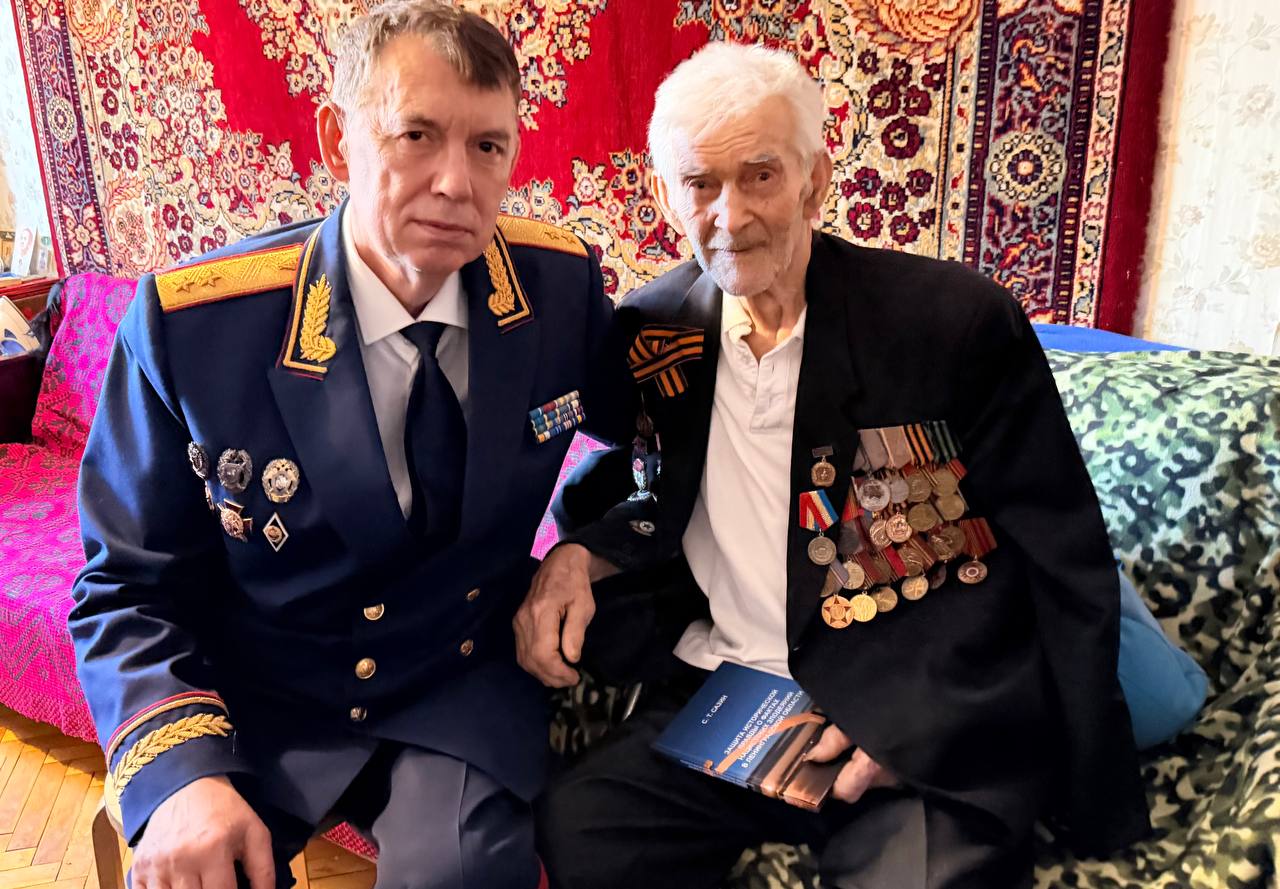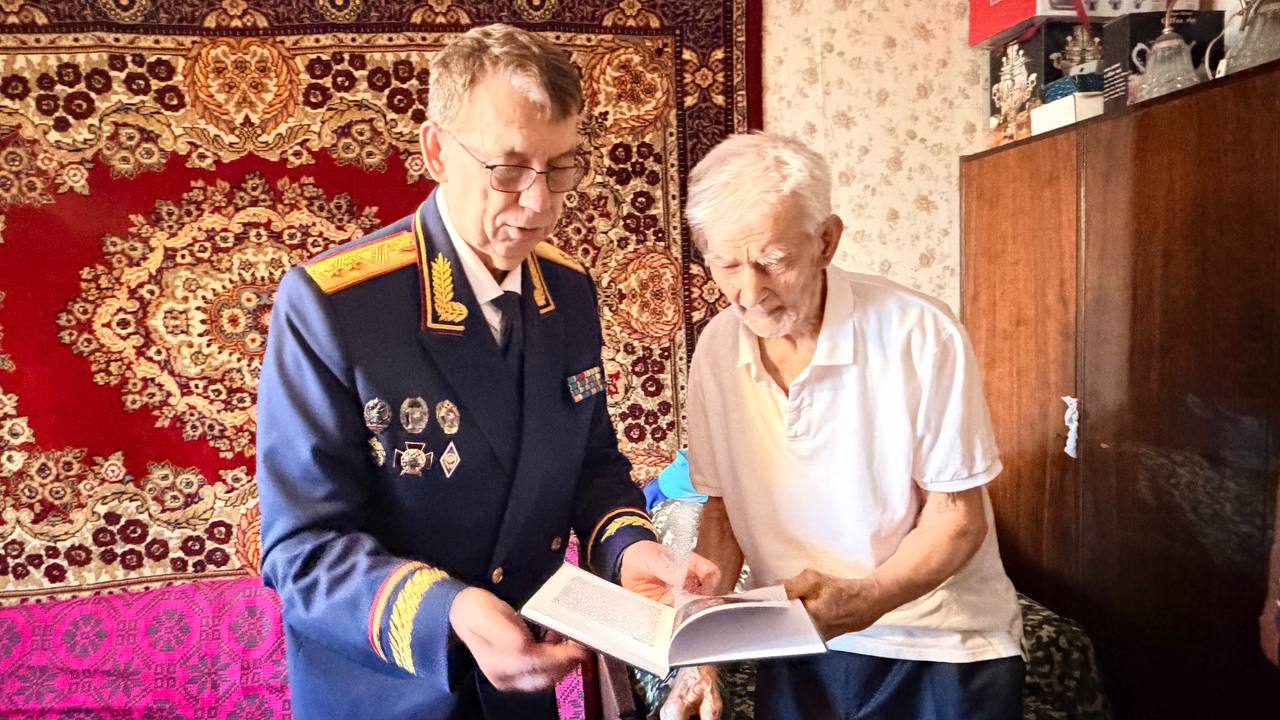 В теплой, душевной обстановке Сергей Тихонович пожелал имениннику крепкого здоровья, бодрости духа и благополучия, поблагодарив за мужество и героизм, проявленные в годы войны, а также за многолетний труд и вклад в воспитание подрастающего поколения. В ходе визита руководитель управления подарил ветерану памятный подарок — книгу под собственным авторством «Защита исторической правды о фактах нацистских злодеяний в Ленинградской области», выпущенную в 2025 году. Издание подготовлено на основе материалов, собранных следователями регионального управления СКР в рамках архивно-поисковой и процессуальной работы по установлению обстоятельств преступлений нацистов в период Великой Отечественной войны на территории Ленинградской области. Общаясь с Николаем Васильевичем, Сергей Тихонович отметил особую важность сохранения памяти о событиях военных лет для будущих поколений. В разговоре руководитель управления поделился с ветераном и личной историей, рассказав, что в этом году его отцу, участнику Великой Отечественной войны, также могло бы исполниться 100 лет. Эта общая дата стала еще одной нитью, связывающей разные поколения защитников Отечества. Встреча стала ярким свидетельством преемственности поколений и глубокого уважения к тем, кто ценой невероятных усилий отстоял свободу и независимость Родины.