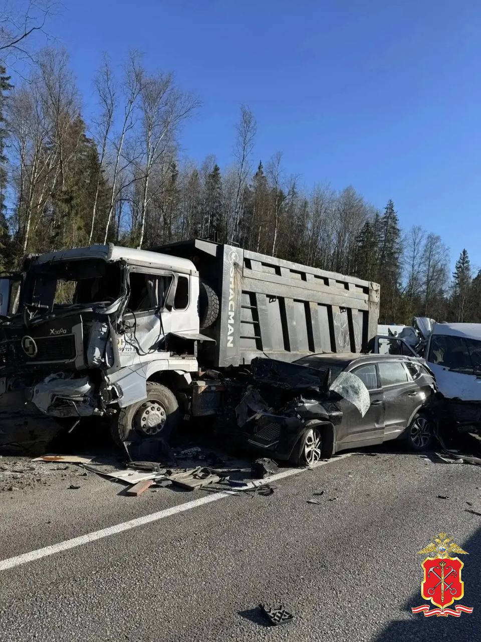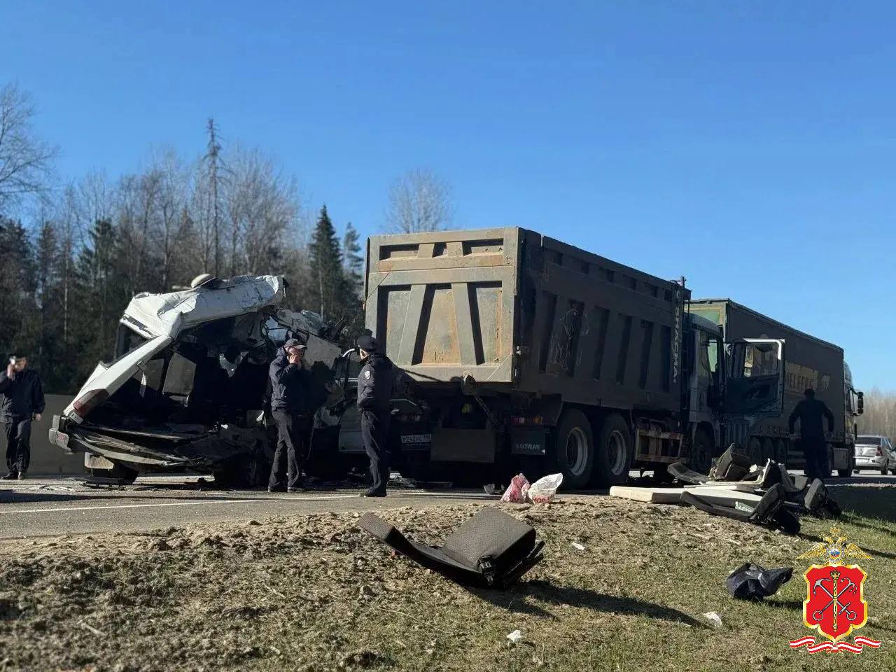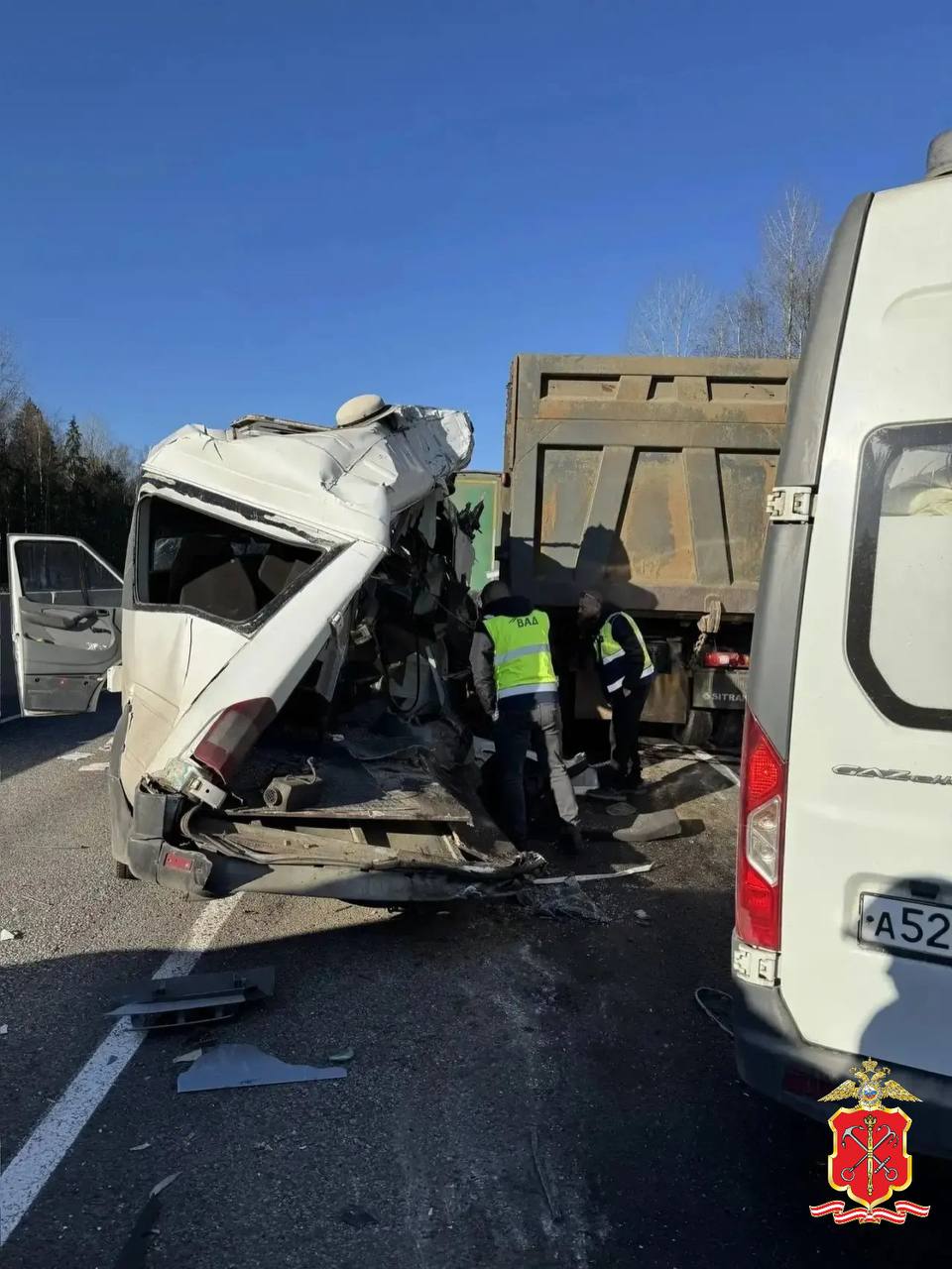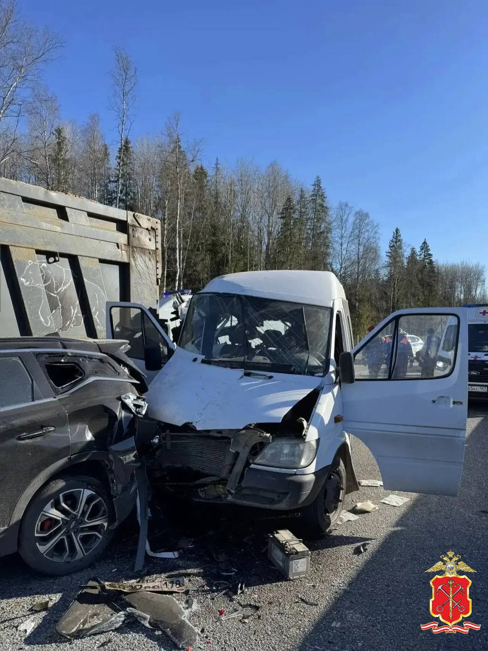 По предварительной информации, сегодня около 07:20 на 97 километре автодороги А-120 «Санкт-Петербургское южное полукольцо» грузовой автомобиль "Шакман", двигавшийся от Отрадного в сторону Гатчины, "собрал" аварию с участием четырех транспортных средств, среди которых микроавтобус развозки "Мерседес Спринтер", "Черри Тиго", грузовой автомобиль "ДАФ" с прицепом и "Рено Логан".