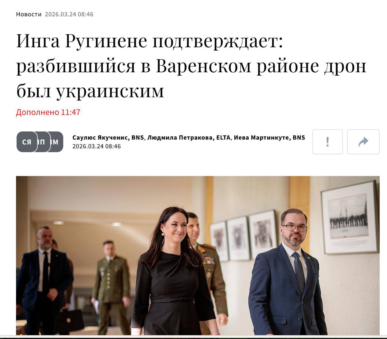 «Дрон, пересёкший наше воздушное пространство и залетевший в Варенский район, был украинским дроном, и он связан с операцией, которую украинцы проводили той ночью, направленной против России. Уже сейчас мы можем с уверенностью сказать, что это был сбившийся с курса дрон», — заявила Ругинене.