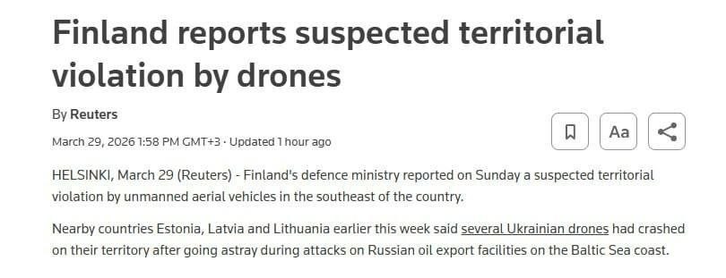 Премьер-министр Финляндии Петтери Орпо заявил, что пару НЛО нарушили территориальную целостность на юго-востоке страны и упали в городе Коувола. Он предложил, что это были украинские беспилотники.
