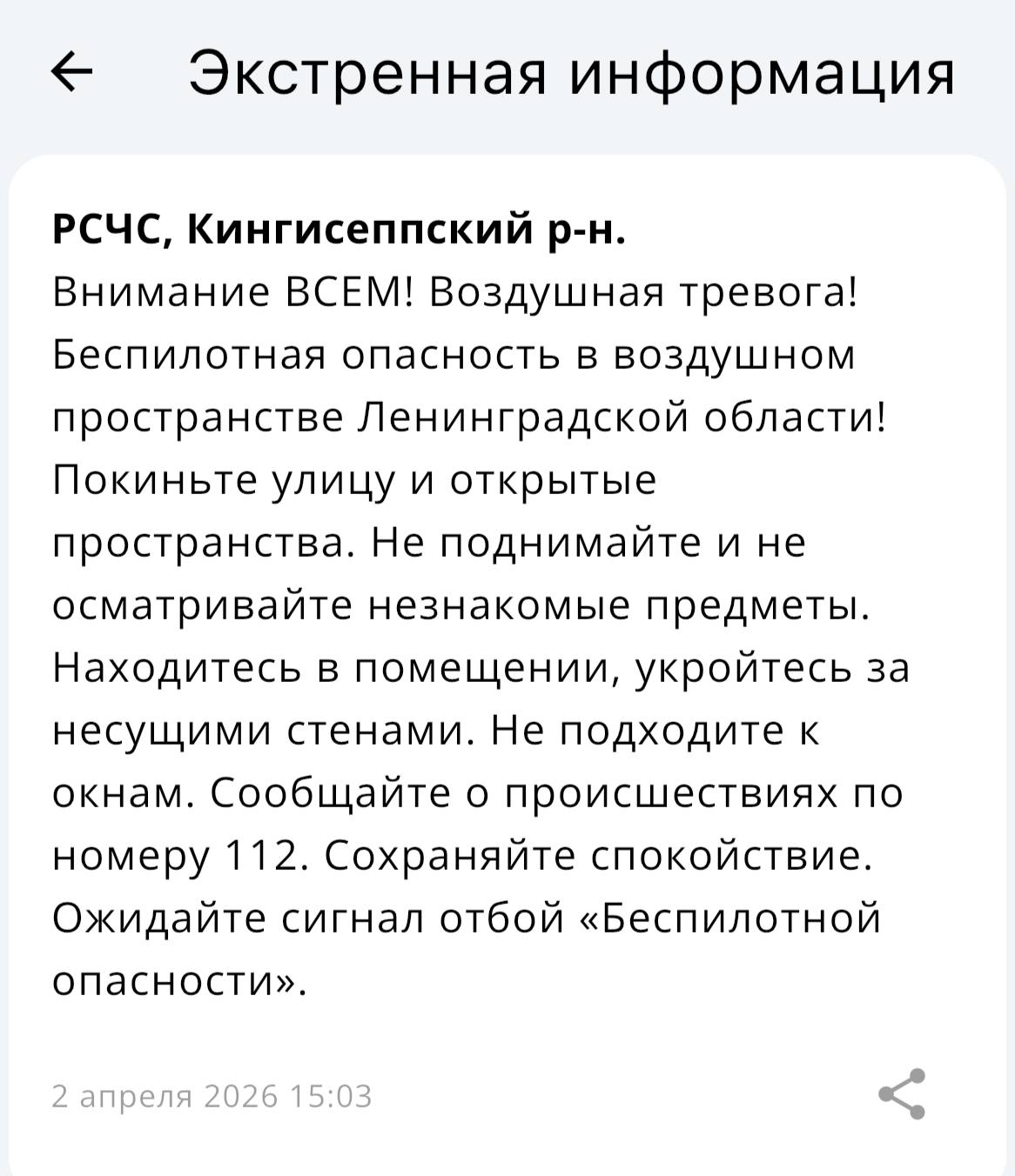 - Объявлена опасность БПЛА в воздушном пространстве Ленинградской области в Выборгском и Кингисеппском районах — Александр Дрозденко Возможно понижение скорости мобильного интернета. Online47 — Всё о Ленобласти и не только | Мы в MAX// Online47