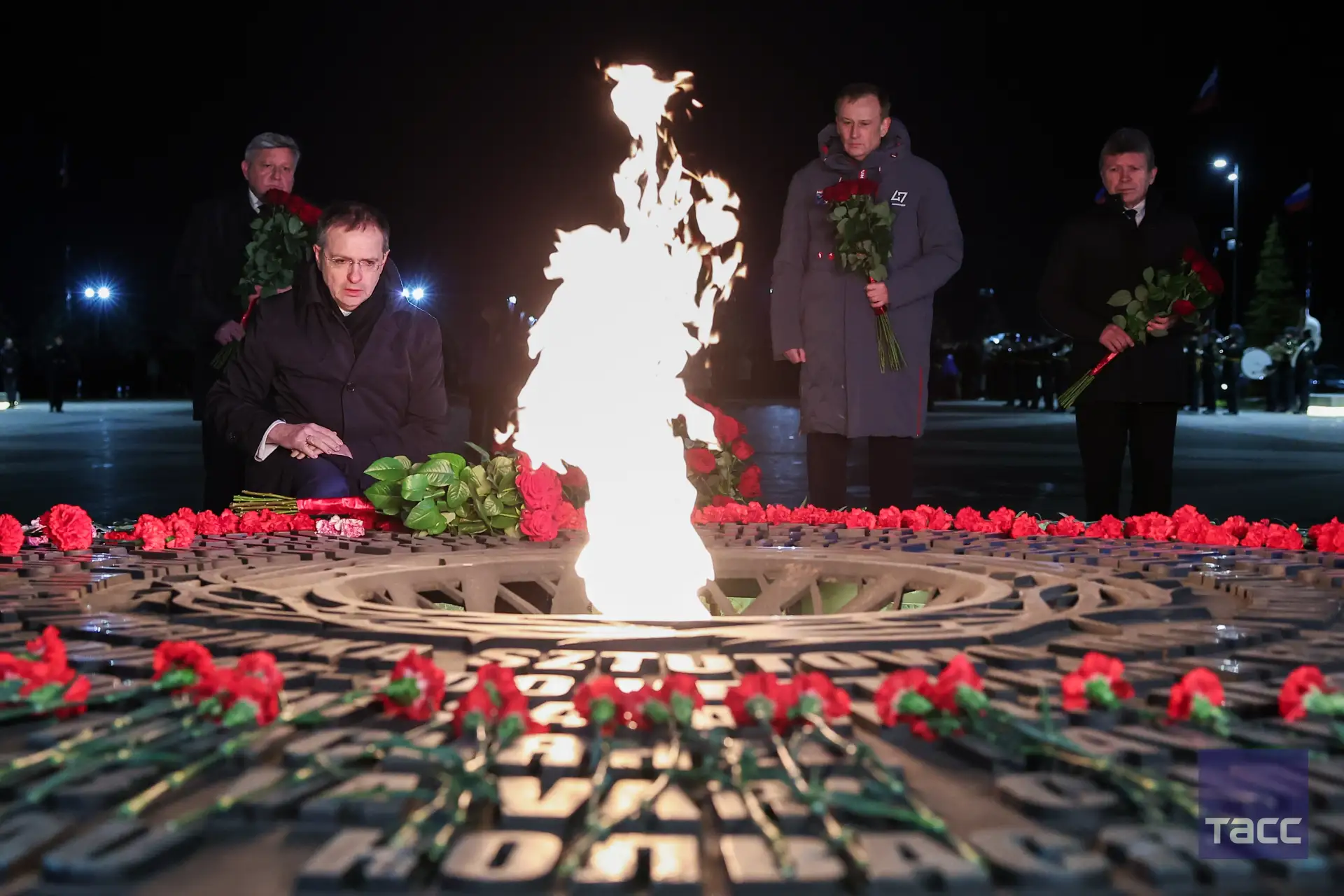 Владимир Мединский, Александр Дрозденко и Елена Малышева возложили цветы к мемориалу "Мирным жителям СССР — жертвам нацистского геноцида в годы Великой Отечественной войны" в Ленинградской области.