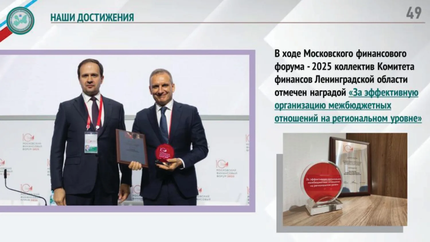 На Московском финансовом форуме комитет финансов Ленинградской области получил награду «За эффективную организацию межбюджетных отношений на региональном уровне». Её вручили только одному региону.