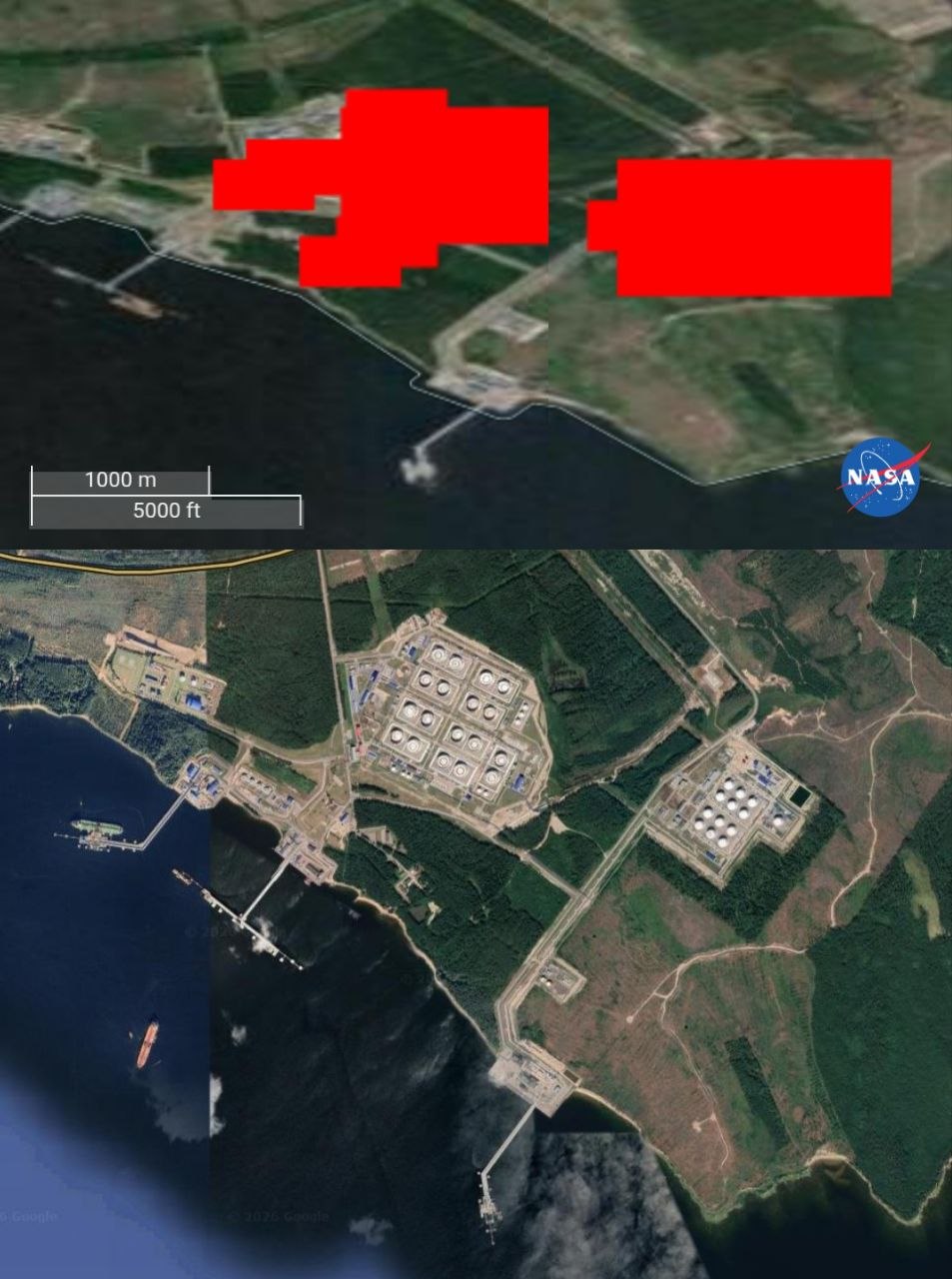Сайт NASA фиксирует пожары на нефтяных терминалах, а в интернете гуляют сами видео от местных жителей.