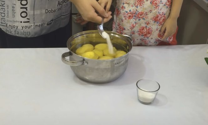 Проверить готовность картофеля можно с помощью ножа: если он легко протыкается, значит, картошка готова. В конце варки воду необходимо аккуратно слить, предостерегая себя от ожогов паром.