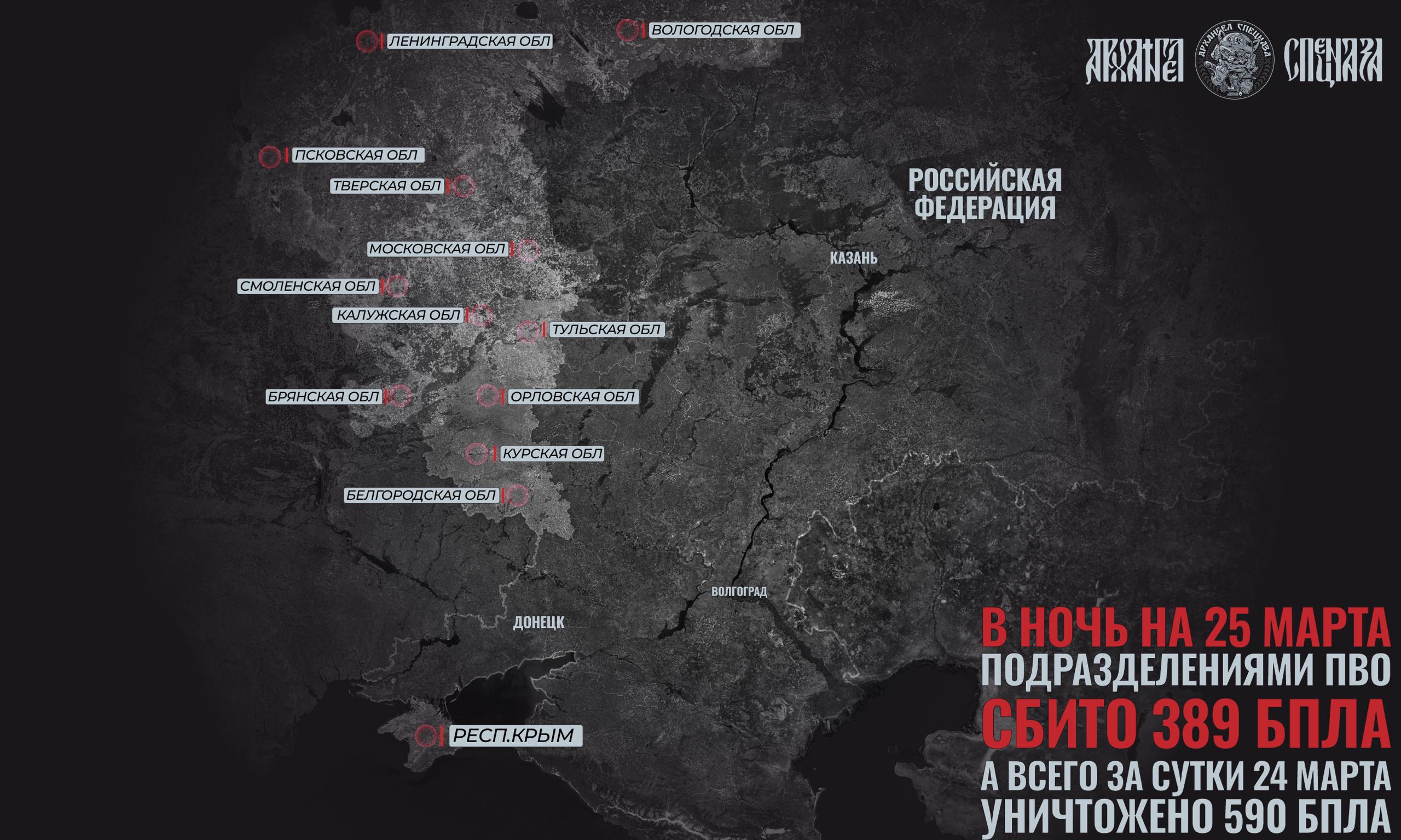 Эта ночь не стала исключением. В результате массированного запуска БпЛА подразделениями ПВО было сбито 389 беспилотников.