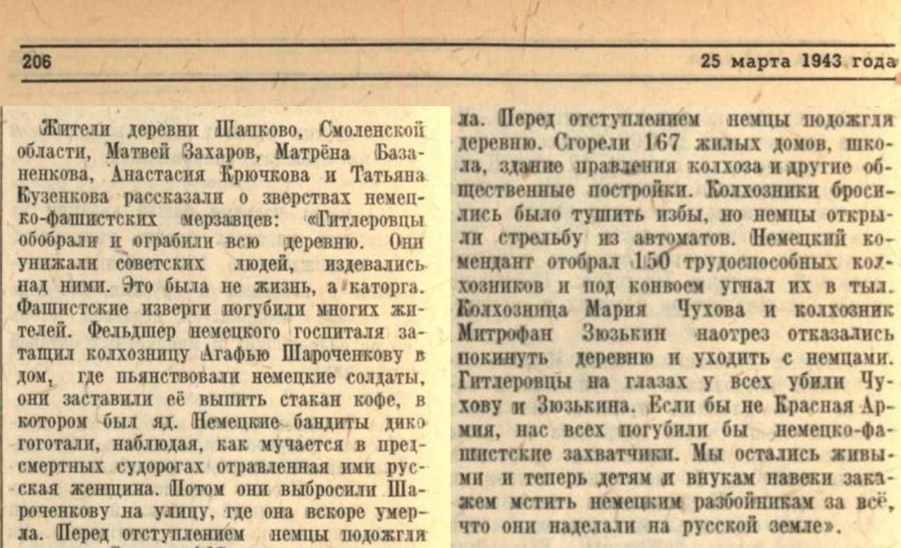 В 1943 году жители деревни Шапково Смоленской области свидетельствовали о массовых преступлениях оккупантов — грабежах, насилии и убийствах мирного населения: