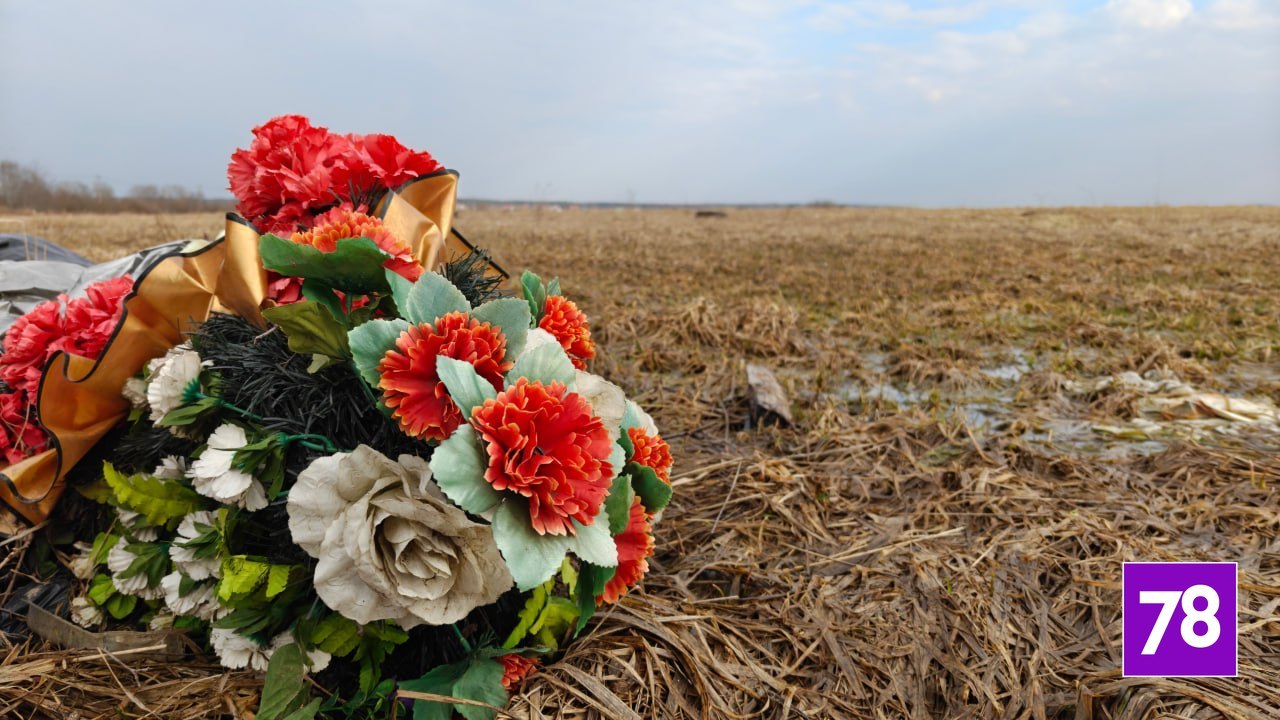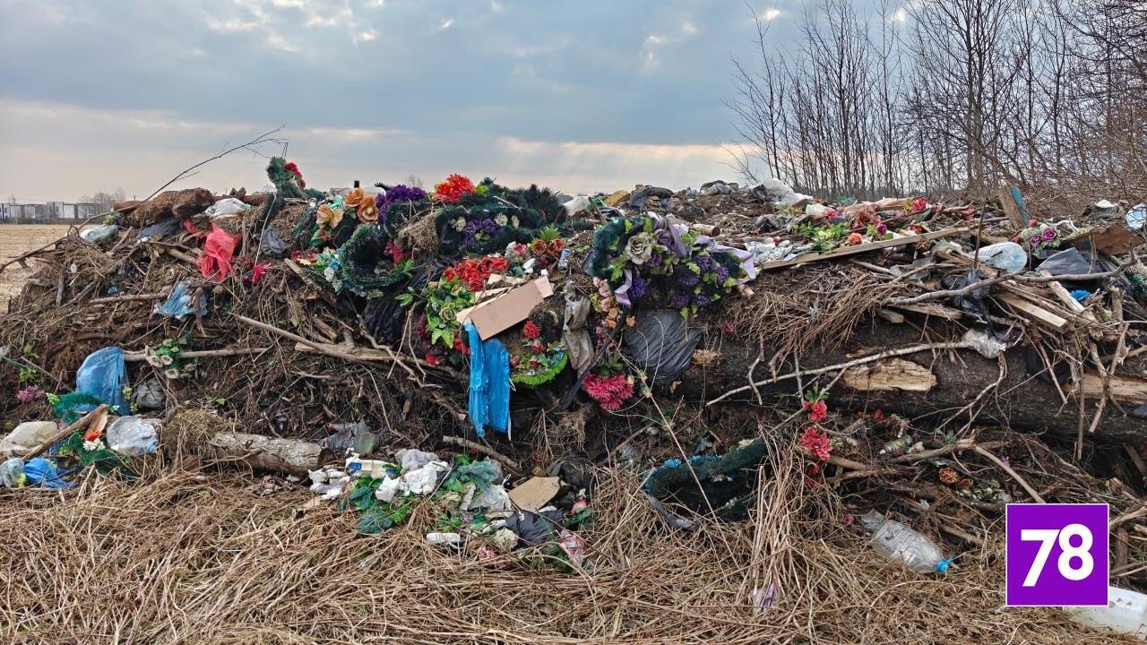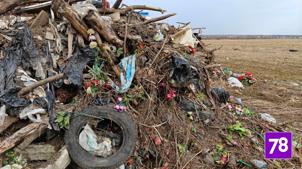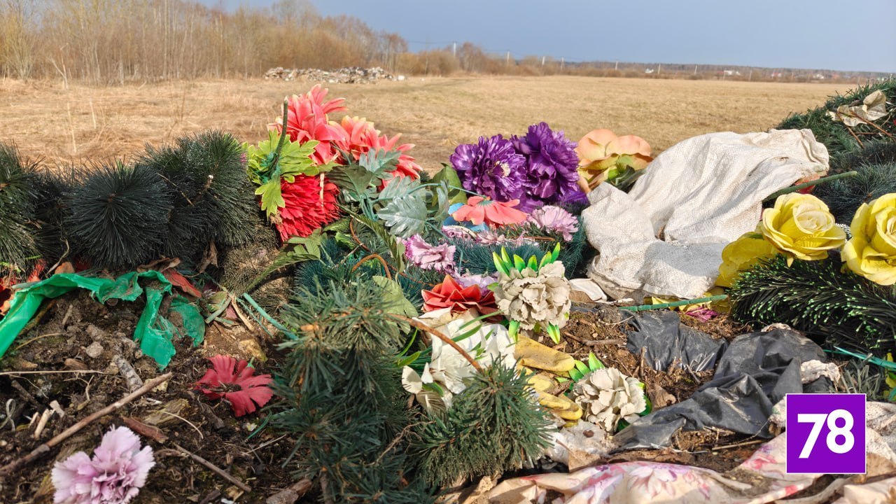 Кладбищенские венки, ленты и фрагменты памятников выбросили в поле в Ломоносовском районе Ленобласти