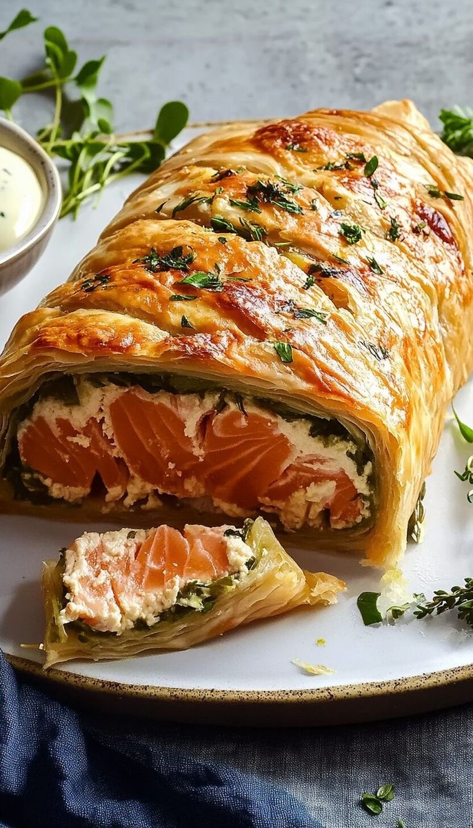 Это блюдо стало неотъемлемой частью праздничного стола, напоминая о знаменитом «Веллингтоне», но при этом является более легким и утонченным рыбным деликатесом. Хрустящее тесто обрамляет нежный лосось, сохраняя все соки внутри и позволяя рыбе медленно готовиться на подушке из свежего шпината.