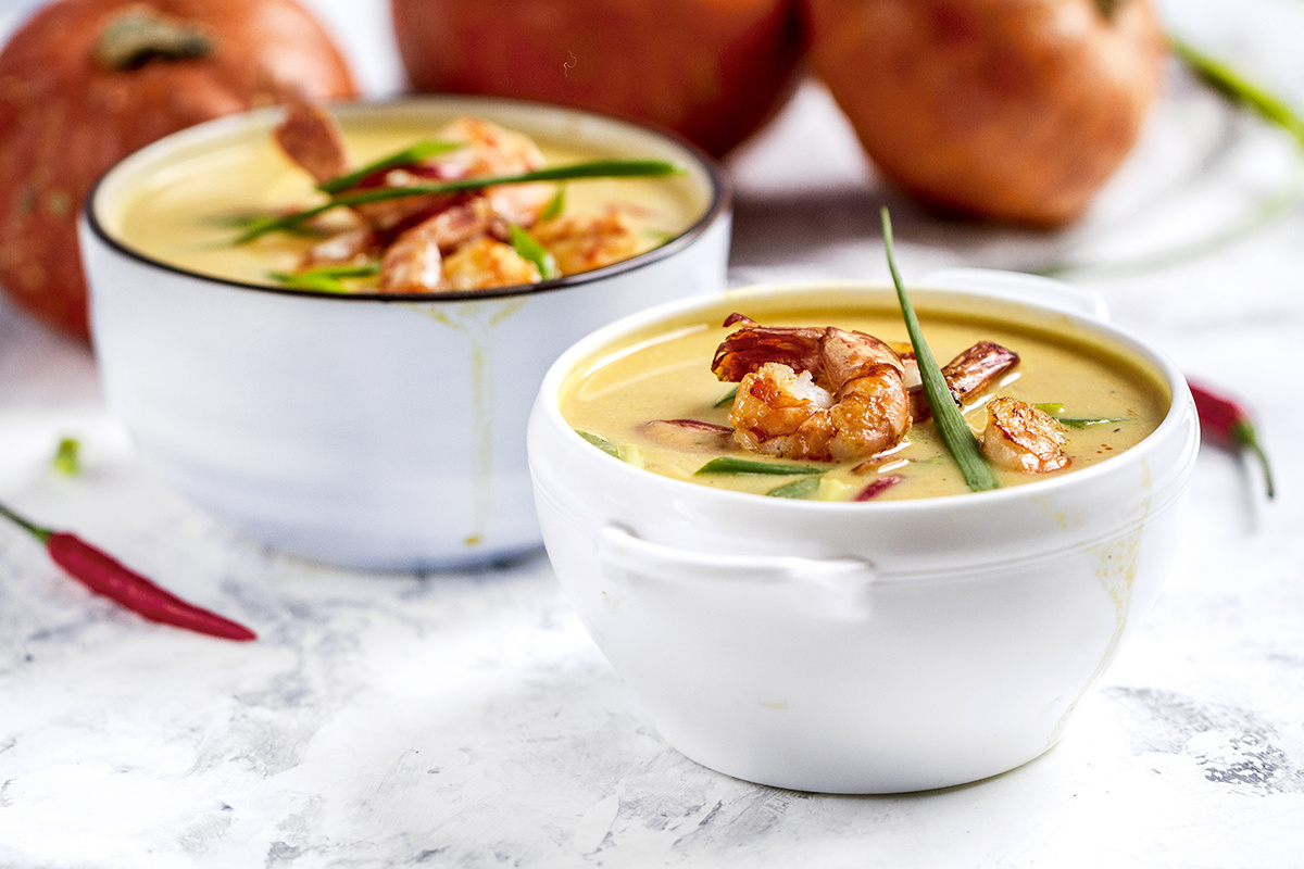 Приготовление тыквенного крем-супа с тигровыми креветками займет всего 20-25 минут, а вес готового блюда составит около 1400 граммов и вполне хватит на четверых.