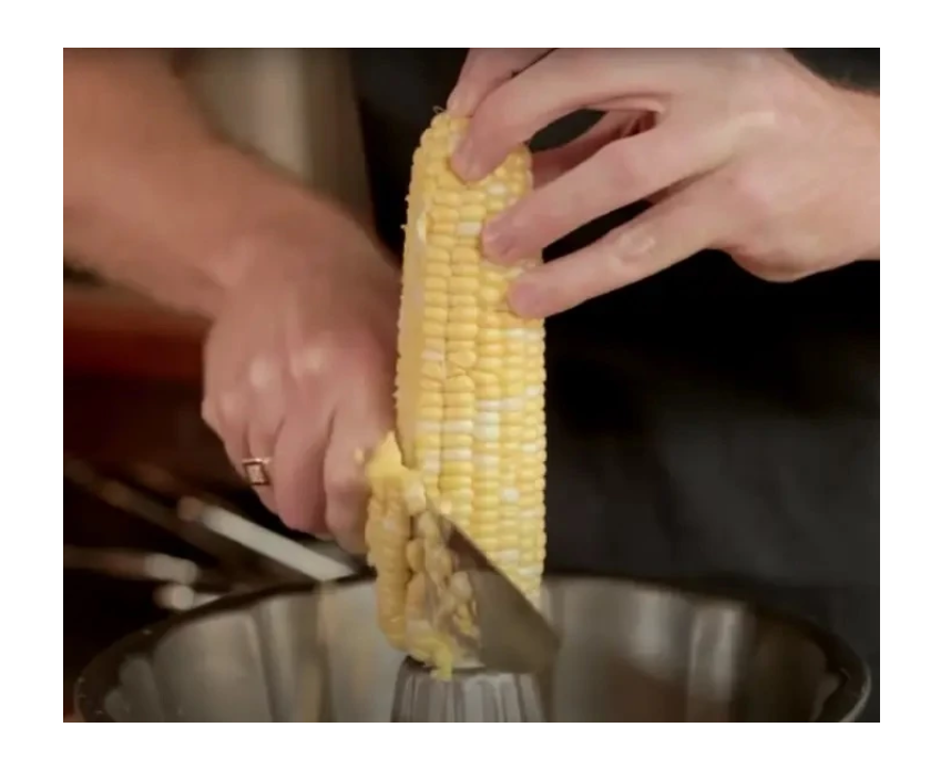 Салат из вареной кукурузы может стать отличной закуской, если использовать металлическую форму для кексов. Вставьте початок кукурузы в отверстие, и при помощи ножа аккуратно обрежьте зерна. Все очистки окажутся в форме, а стол останется чистым.