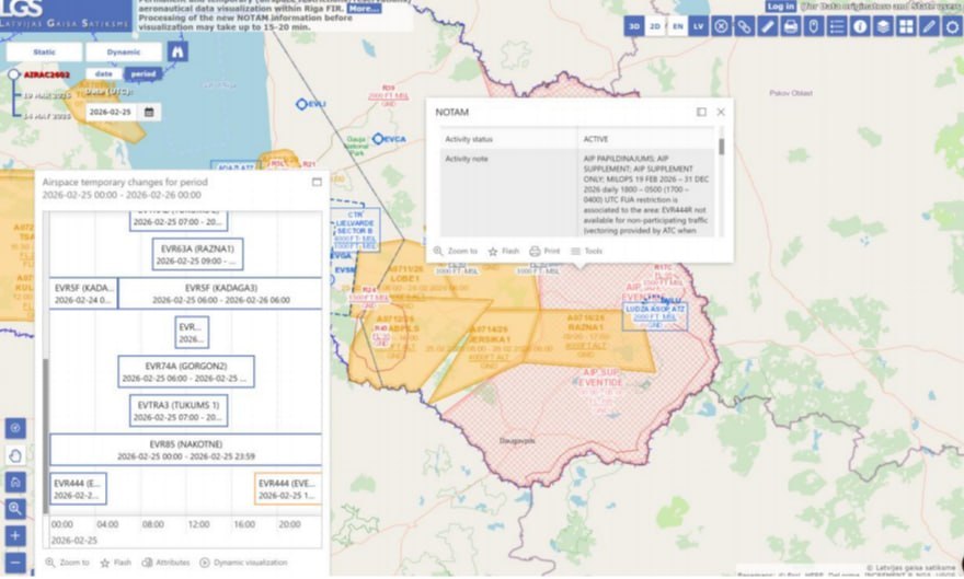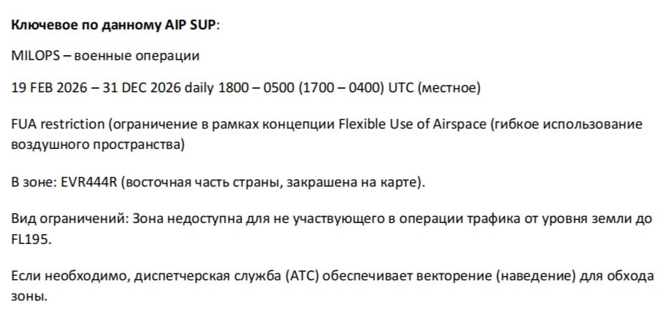 Латвия 19 февраля ввела до конца года ограничения на полёты авиации в зоне, где позже зафиксировали падение беспилотника ВСУ, летевшего в Россию. Ограничение действовало в ночное время — с 17:00–18:00 до 04:00–05:00, по требованию национальных военных властей.