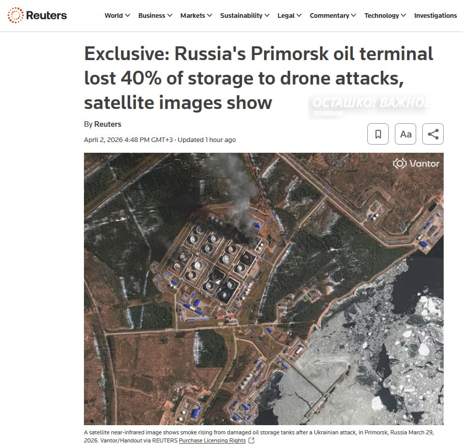 По данным издания и спутниковых снимков, в результате украинских атак порт «Приморск» в Ленинградской области лишился как минимум 40% мощностей по хранению нефти. Повреждены не менее 8 резервуаров, каждый объёмом около 50 тыс. м.
