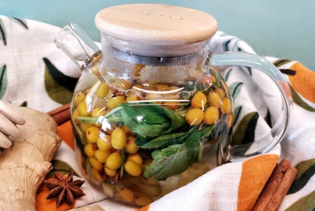 - 75 г облепихи — источник витаминов и антиоксидантов.