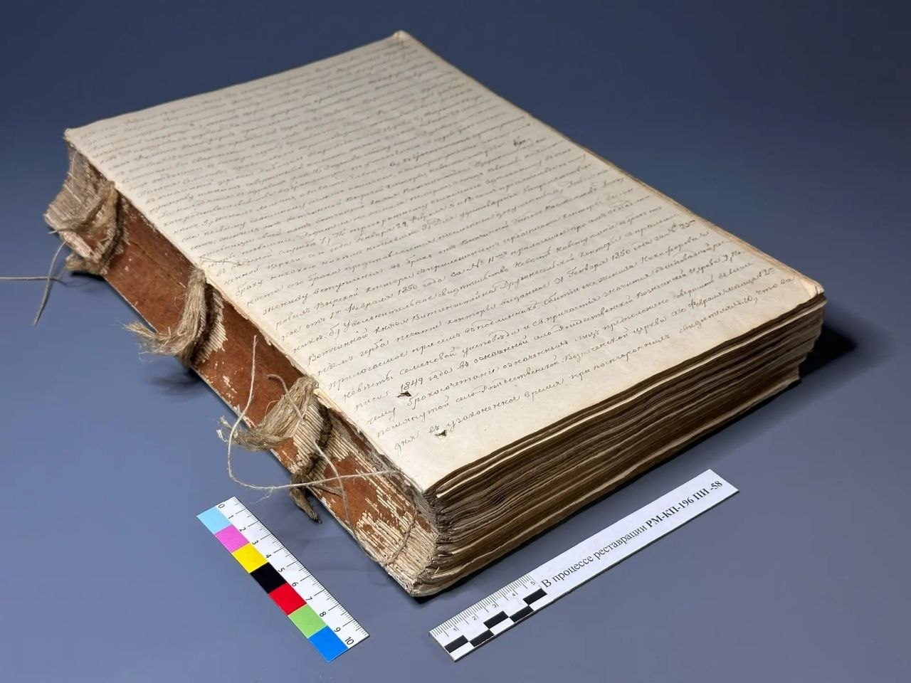 Годы его не пощадили: переплёт крошился, а шёлковый шнурок почти сгнил. Новый мастер сплел своими руками — на деревянной вилке, как в старину. А потом бережно соединили листочек за листочком.