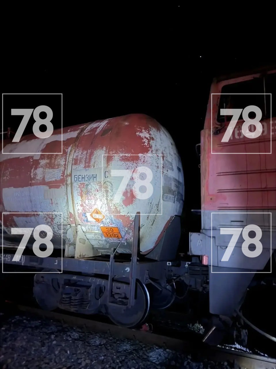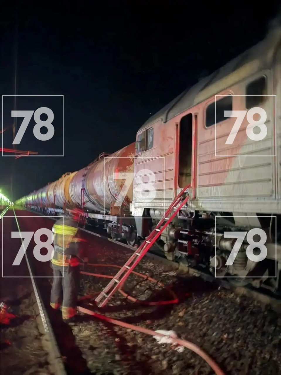 На место происшествия также был направлен пожарный поезд, оснащенный 195 тоннами воды и 2,5 тоннами пенообразователя.