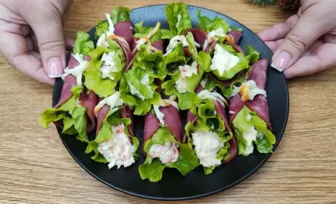 Закуска, о которой пойдет речь, сочетает в себе крабовые палочки, говяжью нарезку, отварные яйца, листья салата и немного майонеза. Это звучит просто, но поверьте, результат оправдает все ожидания. Приступаем к приготовлению!