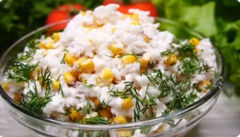 Рыбу разделите на кусочки и добавьте в большую миску вместе с рисом, луком и кукурузой. Заправьте все майонезом, добавьте соль и перец. Подавайте в салатнице, украсив зеленью. Наслаждайтесь отдыхом!