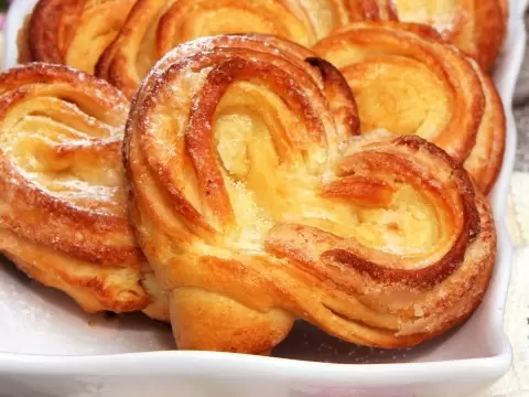 После завершения расстойки, разделите тесто на семь равных частей. Каждую раскатайте в овал, смажьте растительным маслом и посыпьте смесью сахара с ванилью. Затем сверните каждую часть в рулет, сложите пополам, сделайте аккуратный надрез и придайте форму сердечка. Выложите на пергаментный лист.