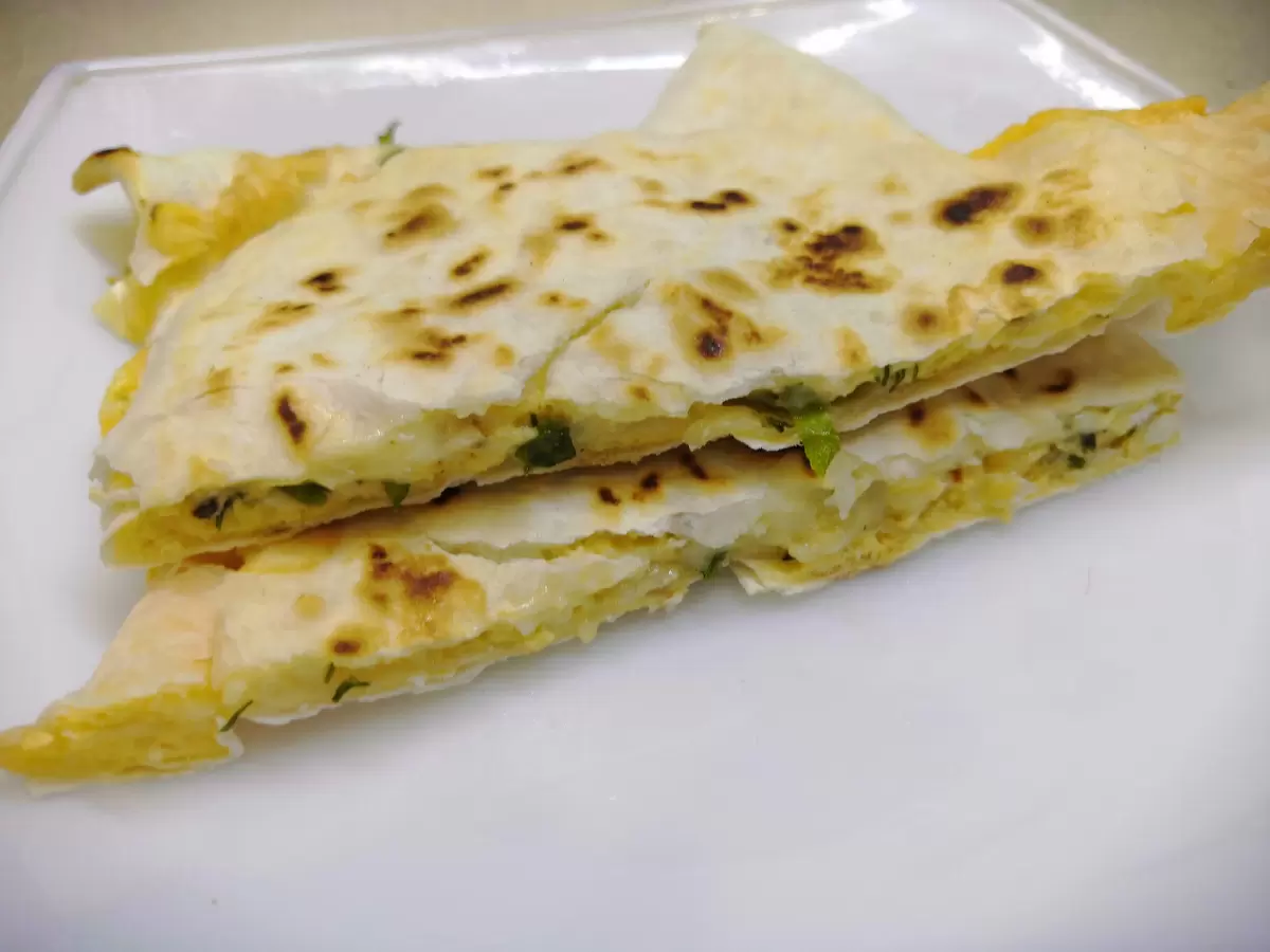 Обжаривание: Сложите лаваш пополам, образовав треугольник. На предварительно разогретой сковороде, смазанной небольшим количеством масла, обжарьте с обеих сторон до золотистой корочки.