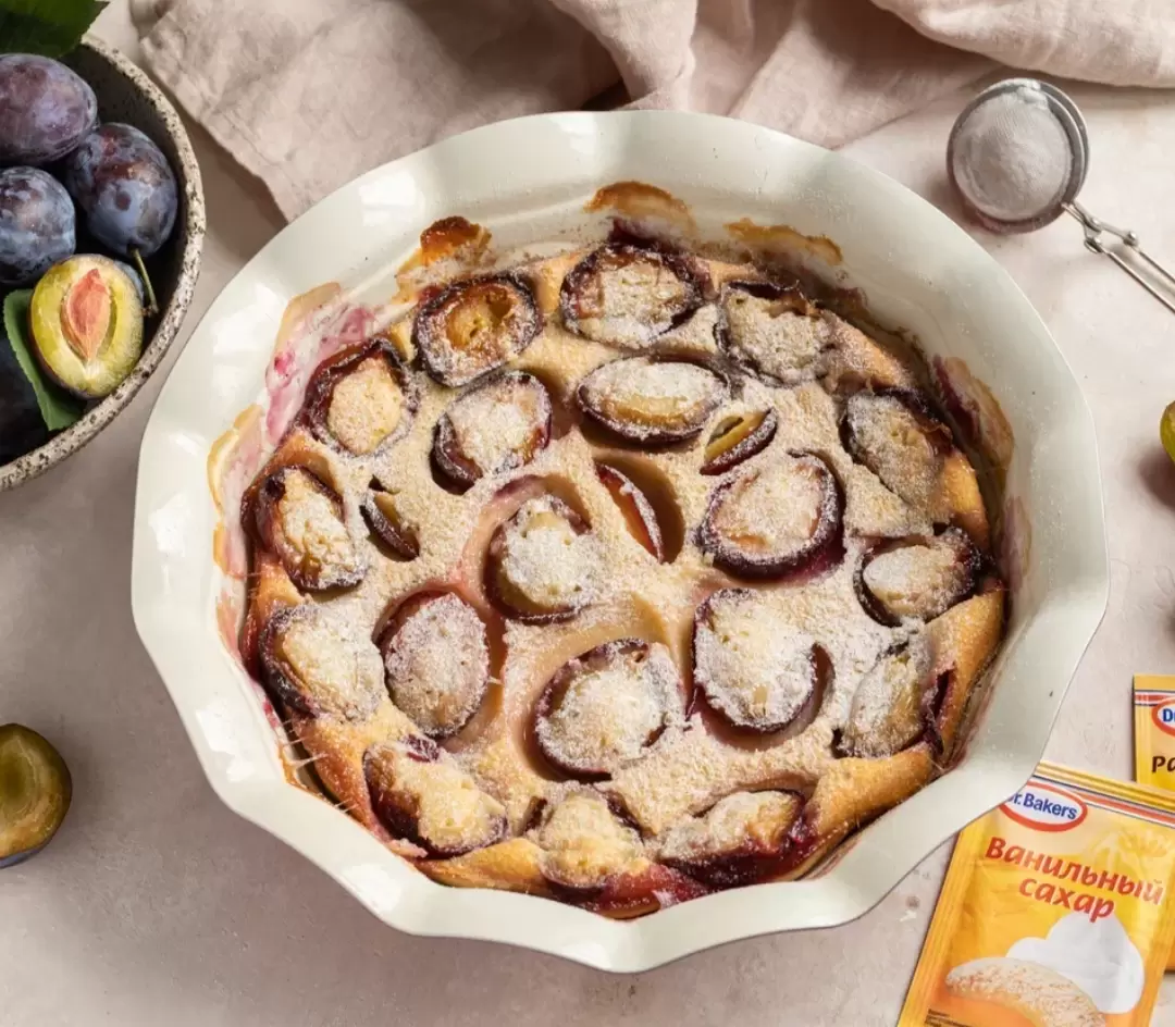 Этот французский десерт подходит для дождливого вечера, когда кислинка спелых слив идеально сочетается со сладким и нежным тестом. Рецепт не требует особых навыков, а добавление ванильного сахара Dr. Bakers придаст пирогу изысканный вкус. Кроме слив, можно использовать и другие фрукты, такие как вишню или груши.