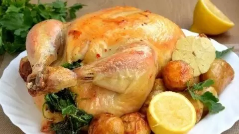 Запеченная курица с лимоном, чесноком и зеленью — это не только вкусное, но и очень эффектное блюдо для праздничного стола. Золотистая курочка, обладающая тонкой румяной корочкой, легко украсит любое торжество. Приготовление этого кулинарного шедевра не требует особых навыков, ведь вам не нужно разбирать курицу на части или замачивать её заранее. Все, что потребуется — это натереть курицу солью и перцем, а затем нафаршировать ее зеленью, чесноком и дольками лимона перед запеканием в духовке. Молодой картофель, запеченный вместе с курицей, отлично впитывает ароматные соки, становясь перфектным гарниром.