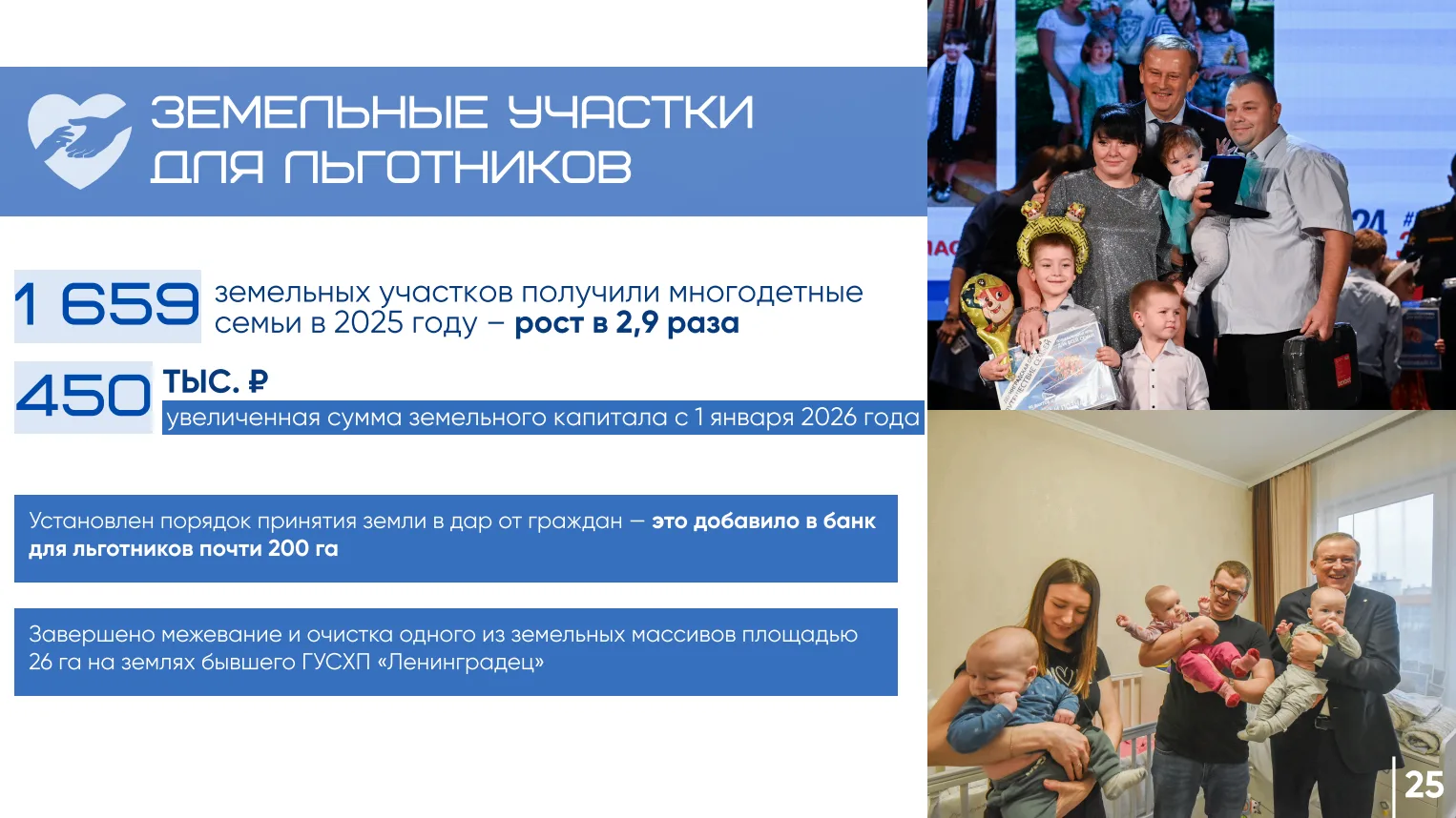 В 2025 году многодетным семьям выдали 1 659 участков — в 2,9 раза больше, чем ранее. Почти 200 гектаров добавили в банк для льготников благодаря порядку принятия земли в дар от граждан. С 2026 года «земельный капитал» увеличен до 450 тыс. рублей.