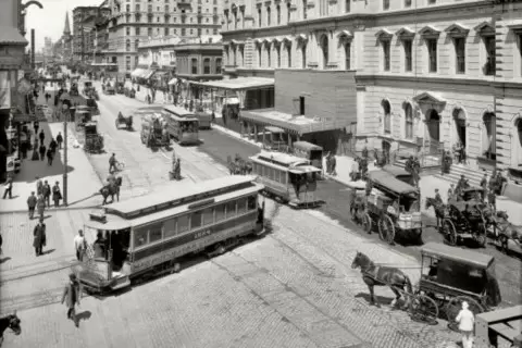 - Манхэттенский вокзал, 1903: Снимок этого вокзала представляет собой потрясающее сочетание стиля и практичности; трамваи на канатной тяге соседствовали с конными повозками, символизируя технологический прогресс и традиции старого Нью-Йорка.