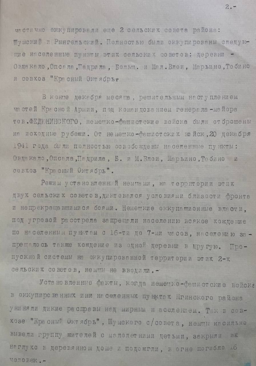 «Установлены факты, когда немецко-фашистские войска в оккупированных ими населенных пунктах Мгинского района учиняли дикие расправы над мирным населением. Так в совхозе «Красный октябрь», Шумского с/совета, немцы насильно вывели группу , жителей с малолетними детьми, закрыли их наглухо в деревянном доме и подожгли, в огне погибло 16 человек».