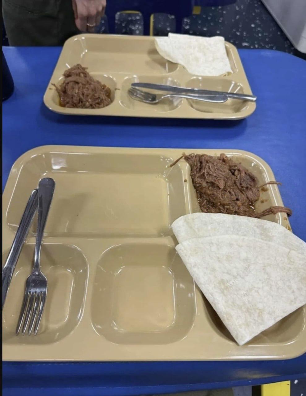 "На обед подают полупустые подносы, например, с небольшой порцией измельчённого мяса и тортильей или горстью варёной моркови, сухой мясной котлетой и серым переработанным мясом. "