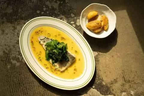 Первый укус дарит легкий дымный оттенок, который быстро сменяется на мягкий сливочный привкус. Нежная структура рыбы в сочетании с шпинатом придаёт блюду дополнительную сочность, а соус гармонично дополняет отдельные порции картофеля.