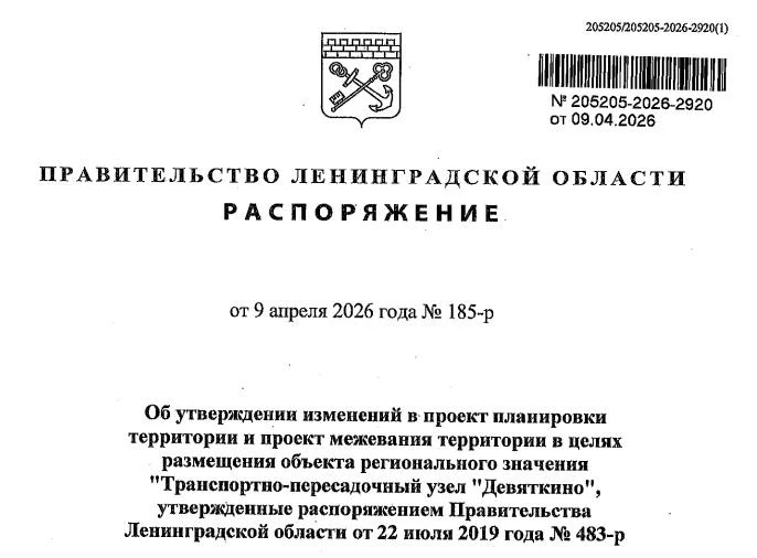 Правительство Ленинградской области утвердило изменения в документацию по планировке территории для ТПУ «Девяткино».