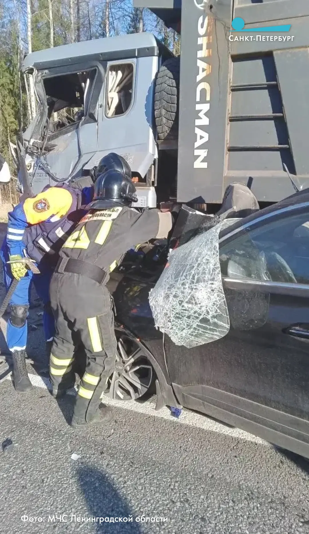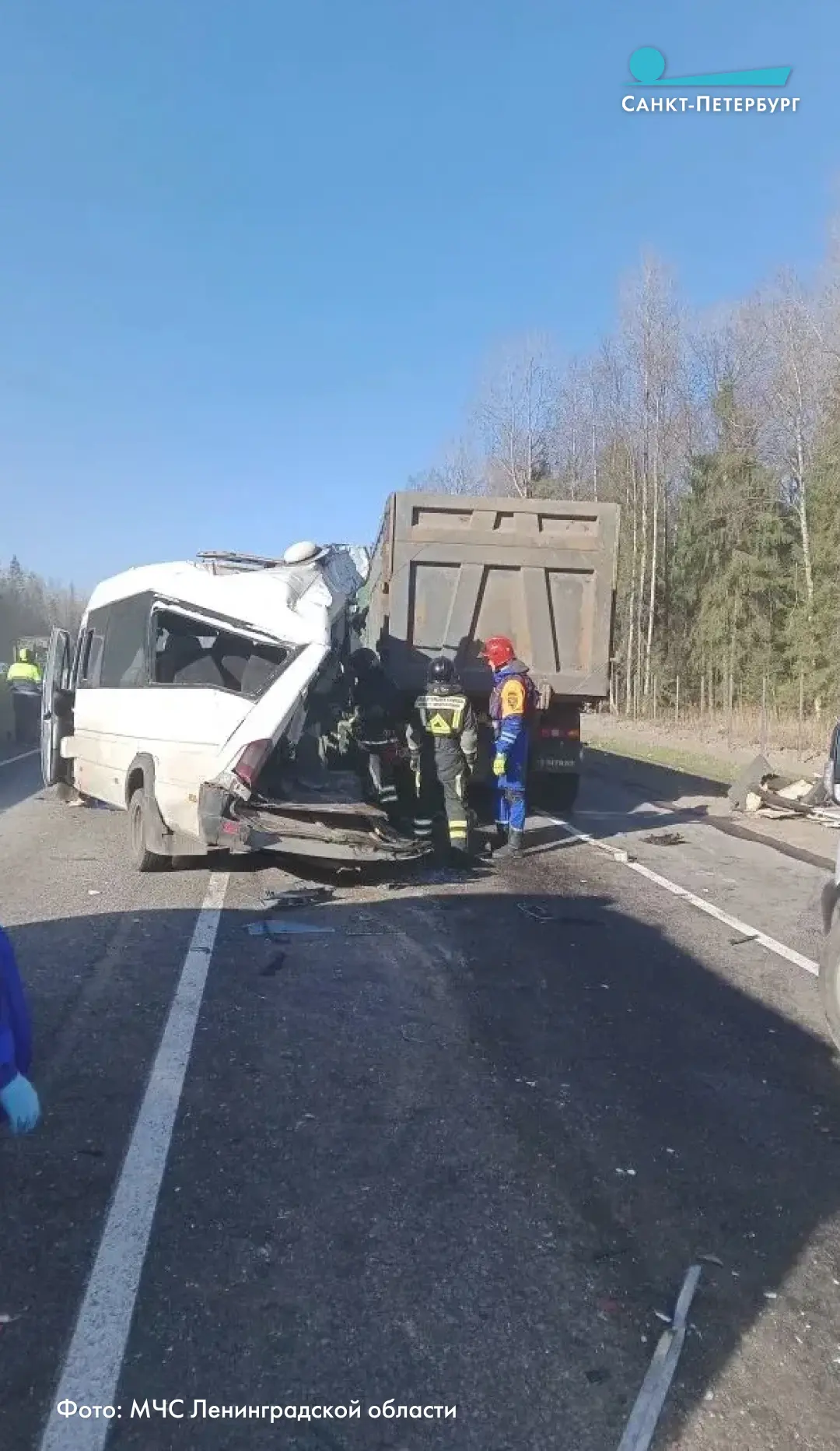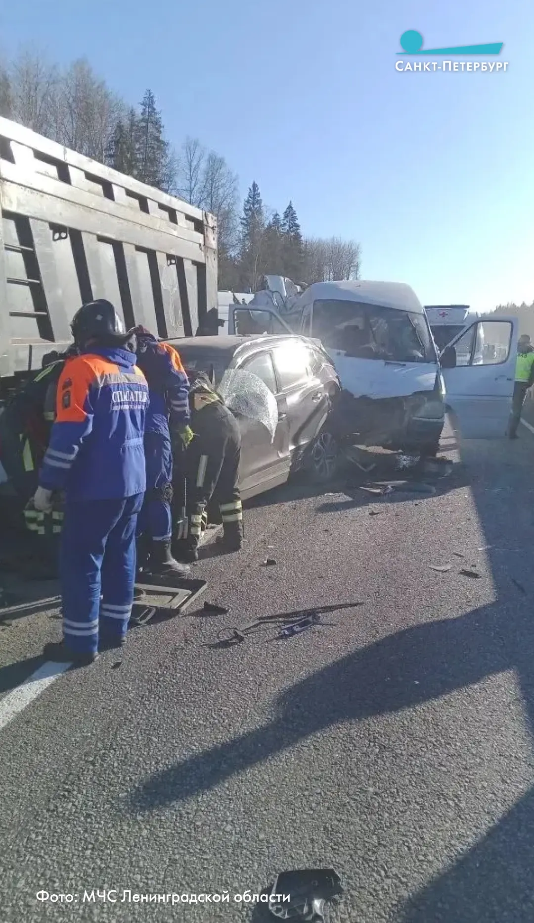 Двоих госпитализировали в Тосненскую больницу, остальных осмотрели на месте. Столкнулись пять автомобилей: микроавтобус, два грузовика и две легковушки.