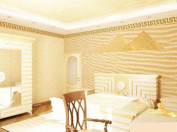 Непременным атрибутом станет живопись и фотографии, которые оформлены в египетском антураже. Для пола идеально подойдет светлая плитка с золотистыми прожилками или паркет. В центре можно разместить ковер с египетскими мотивами, который станет ярким акцентом.