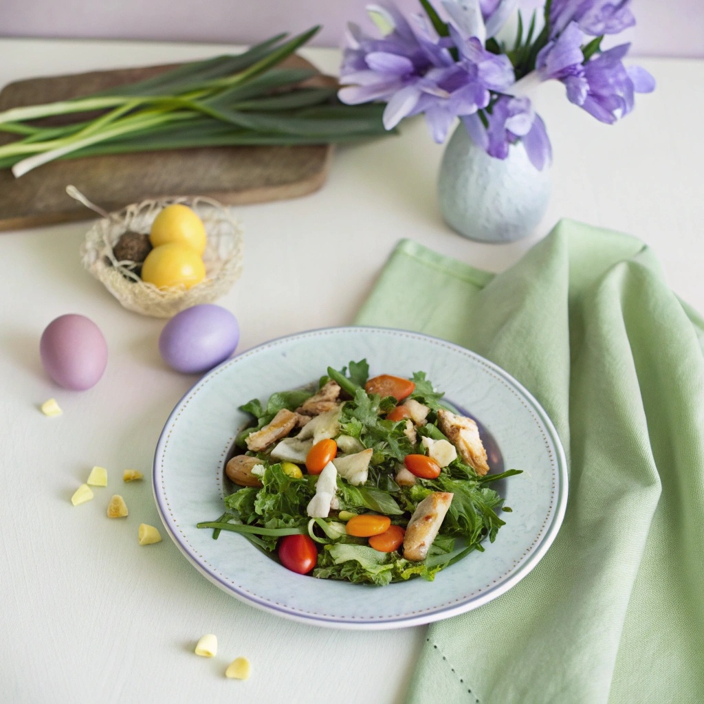 Приготовление включает обжарку куриного филе до золотистой корочки и его нарезку на тонкие ломтики. Затем овощи — помидоры черри, огурец и болгарский перец — следует нарезать и смешать с салатным миксом. Заправка из оливкового масла и лимонного сока подчеркивает вкус блюда.