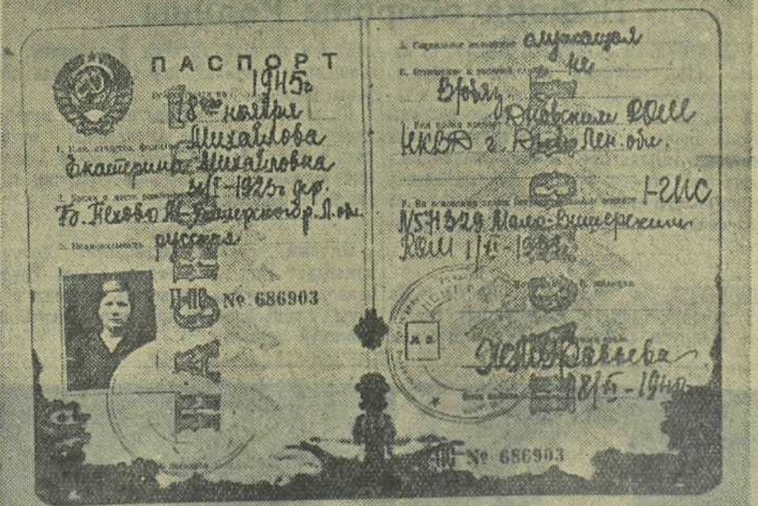 В бою близ Порхова наши бойцы взяли в плен двух немецких солдат. У одного из них нашли советский паспорт за номером II-ПС № 686903, выданный Екатерине Михайловне Михайловой, родившейся в 1923 году в Большом Пехове, Мало-Вишерского района, Ленинградской области, по профессии акушерке. Фотография — хорошее русское лицо. На паспорте пятна — следы крови.